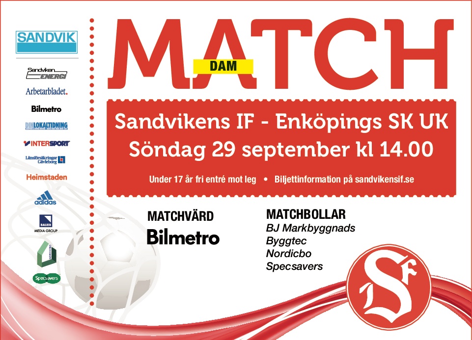 Här är biljettlänken direkt till matchen (kostar endast 60 riksdaler): https://sandvikensif.ticketco.events/se/sv/e/sandvikens_ifdam__enkpings_sk_uk